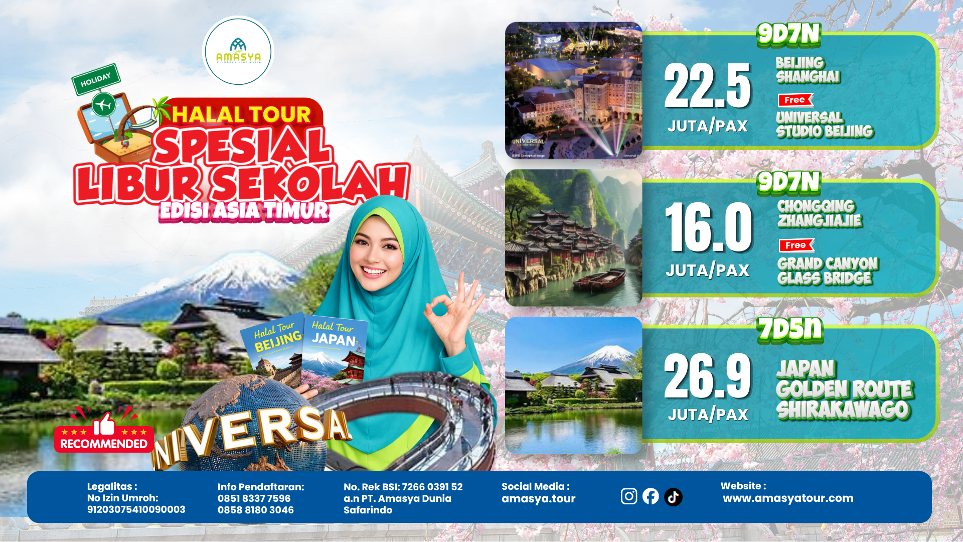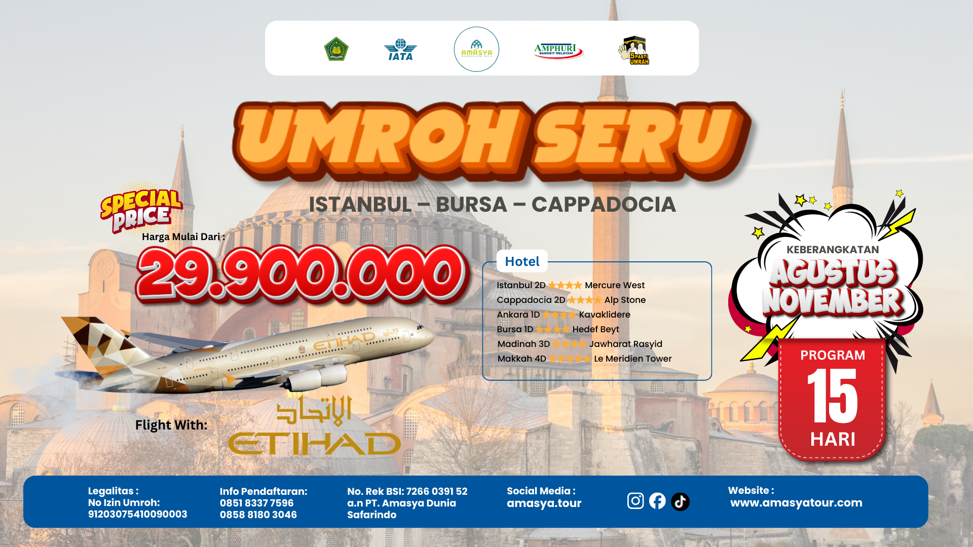 PT. Amasya Dunia Safarindo adalah perusahaan biro perjalanan wisata yang bergerak di bidang Halal Tour & Travel, serta penyelenggara resmi perjalanan ibadah Umrah dan Haji. Dengan pengalaman dan komitmen tinggi, Amasya Tour hadir untuk mewujudkan niat mulia umat Islam dalam menunaikan ibadah dengan pelayanan terbaik, aman, nyaman, dan sesuai sunnah.Â